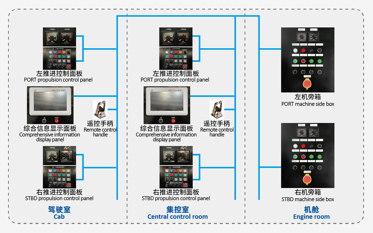 遙控系統(tǒng)由機(jī)旁控制、駕控控制、電池系統(tǒng)控制及綜合監(jiān)控系統(tǒng)組成,整套遙控系統(tǒng)和電力推進(jìn)系統(tǒng)基于PLC控制單元和現(xiàn)場總線網(wǎng)絡(luò)相結(jié)合,實(shí)現(xiàn)船員對于整船動(dòng)力的人機(jī)交互和控制功能,可以通過不同站點(diǎn)實(shí)現(xiàn)對推進(jìn)電機(jī)的啟停、調(diào)速控制,以及各站點(diǎn)的操作切換,同時(shí)可以實(shí)時(shí)監(jiān)控船舶推進(jìn)系統(tǒng)各個(gè)設(shè)備的運(yùn)行狀態(tài)、報(bào)警信息。