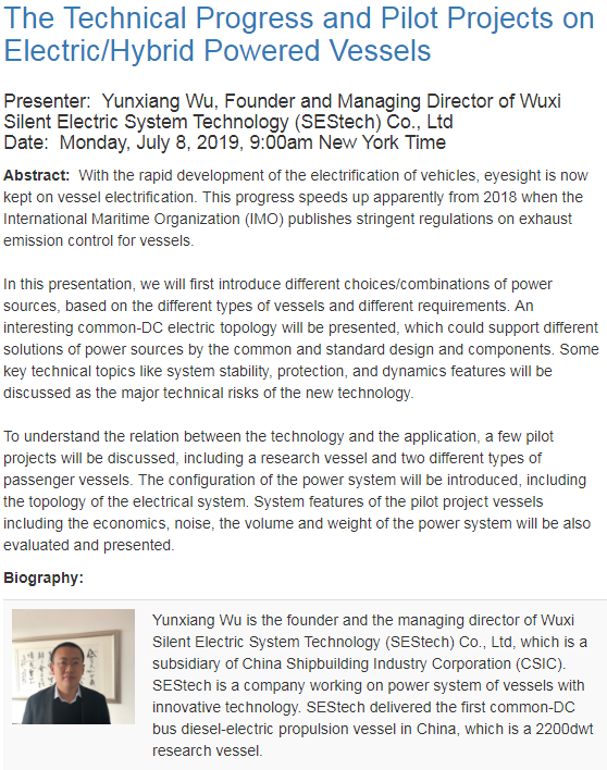 78日,賽思億總經(jīng)理烏云翔在IEEE Transportation Electrification Community舉辦了網(wǎng)絡(luò)研討會(huì),進(jìn)行電力及混合動(dòng)力船舶技術(shù)介紹及實(shí)船案例分享。