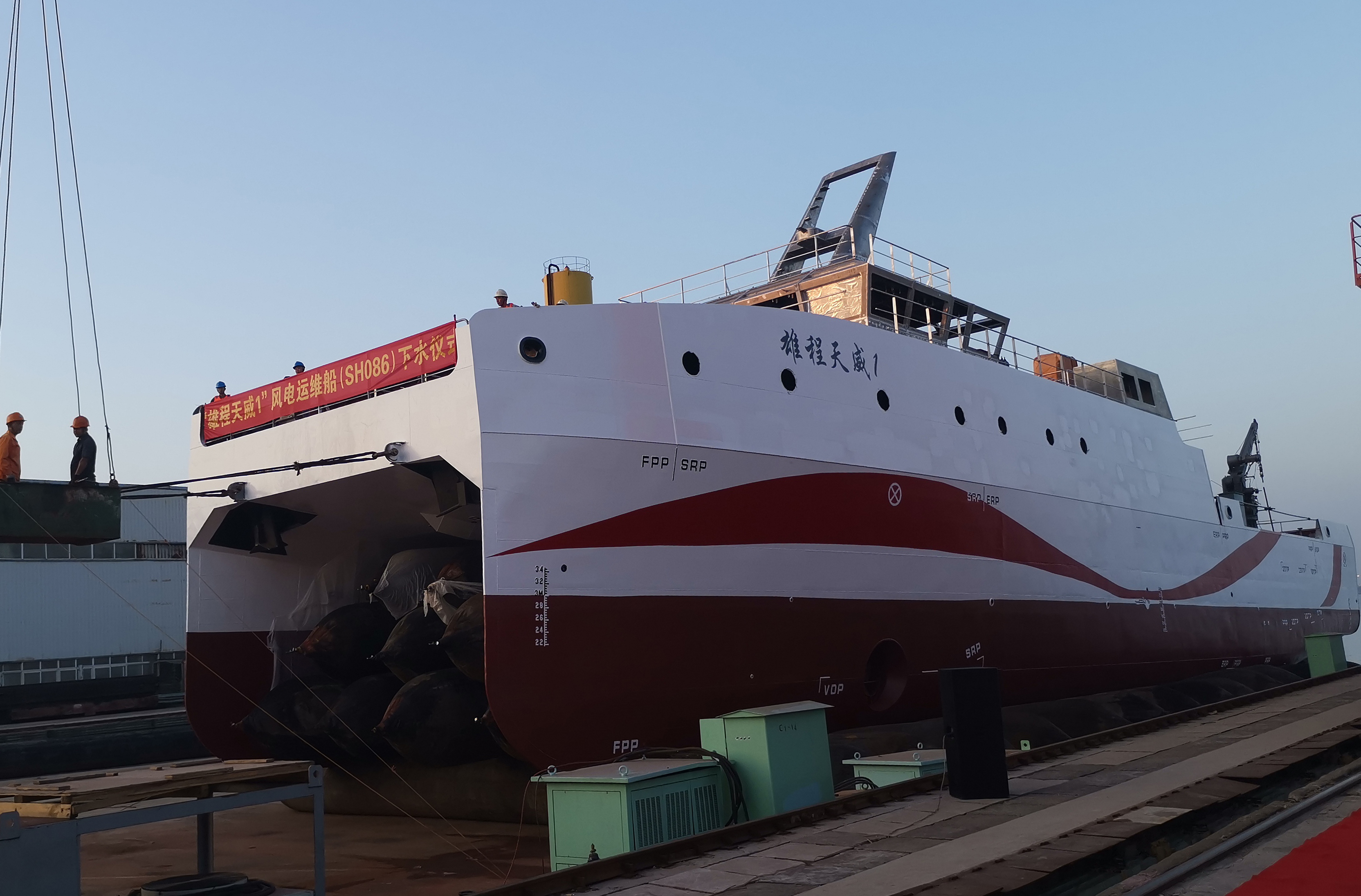 “雄程天威1”號(hào)風(fēng)電運(yùn)維船為雙體船,總長(zhǎng)49.9米,排水量約600噸,是目前國(guó)內(nèi)先進(jìn)的創(chuàng)新型風(fēng)電運(yùn)維船,裝機(jī)容量4.8MW,雙舵槳主推,雙艏側(cè)推,配備賽思億直流組網(wǎng)電力推進(jìn)系統(tǒng)、六自由度波浪補(bǔ)償?shù)浅讼到y(tǒng)和DP-2動(dòng)力定位系統(tǒng),擁有能在4級(jí)風(fēng)海況下進(jìn)行登乘作業(yè)的能力,穩(wěn)性滿足抗8級(jí)風(fēng)的能力,核心設(shè)備實(shí)現(xiàn)國(guó)產(chǎn)化。