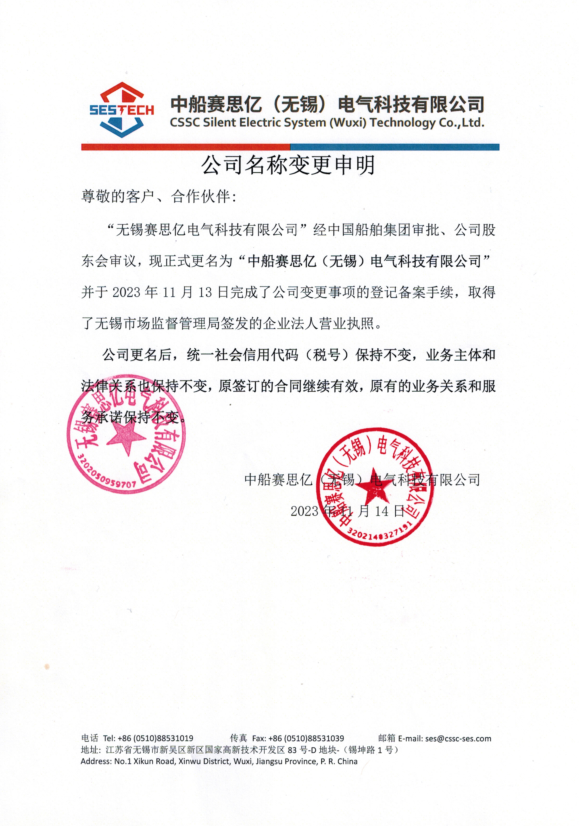 經(jīng)中國(guó)船舶集團(tuán)審批、公司股東會(huì)審議,2023年11月13日,無(wú)錫賽思億電氣科技有限公司正式取得無(wú)錫市場(chǎng)監(jiān)督管理局簽發(fā)的企業(yè)法人營(yíng)業(yè)執(zhí)照,更名為“中船賽思億(無(wú)錫)電氣科技有限公司”,簡(jiǎn)稱(chēng)“中船賽思億”。