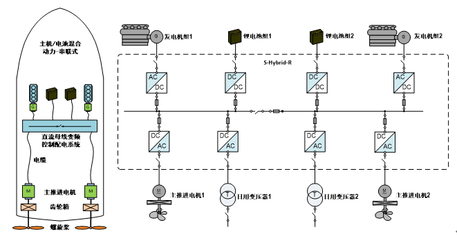 系統(tǒng)配置發(fā)電機(jī)組和超級電容作為游船動力,采用S-Hybrid-R串聯(lián)式解決方案,系統(tǒng)集成度高、接口簡便,明顯改善機(jī)艙設(shè)備占地空間及重量。