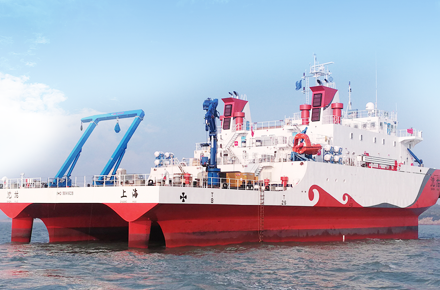 沈括號科學(xué)調(diào)查作業(yè)船,采用S-DE柴電電力推進系統(tǒng),雙體小水線面設(shè)計,2200T科考船,是中國首個直流組網(wǎng)電力推進船舶。